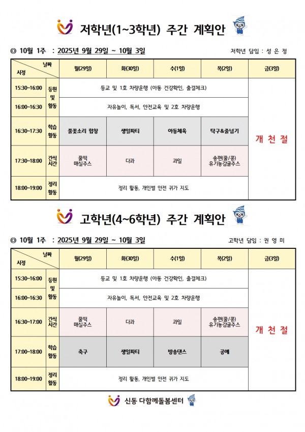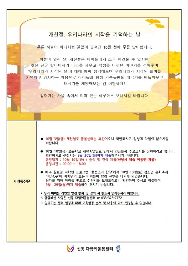 10월 1주차 주간계획안 페이지 정보 작성자 최고관리자 댓글 0건 조회 59회 작성일 25-09-26 15:50 본문 안녕하세요, 신동 다함께돌봄센터 10월 1주차 주간계획안 입니다. 목록 이전글신동 다함께돌봄센터] 10월 휴관 안내 25.09.29 다음글2025년 마을돌봄 사업 공모전 개최 안내 25.09.23 댓글목록 댓글목록 등록된 댓글이 없습니다.