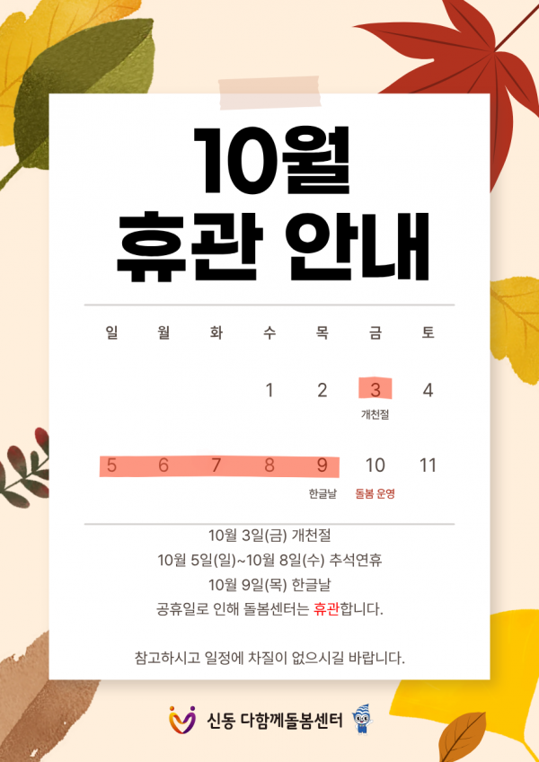 신동 다함께돌봄센터] 10월 휴관 안내