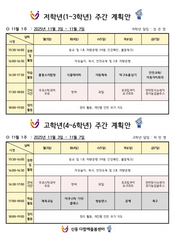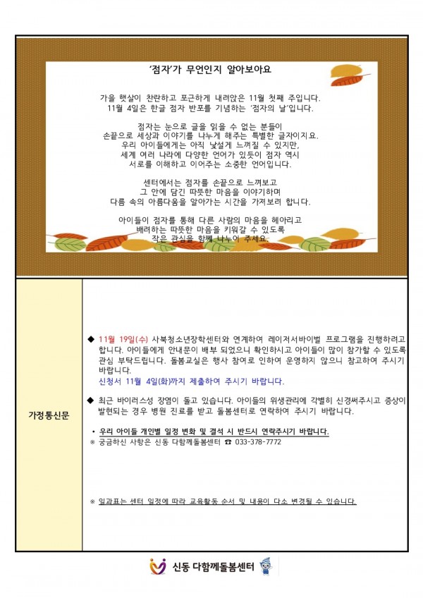11월 1주차 주간계획안 페이지 정보 작성자 최고관리자 댓글 0건 조회 2회 작성일 25-11-07 10:41 본문 신동 다함께돌봄센터 11월 1주차 주간계획안 입니다. 목록 이전글11월 2주차 주간계획안 25.11.07 다음글신동 다함께돌봄센터] 10월 휴관 안내 25.09.29 댓글목록 댓글목록 등록된 댓글이 없습니다.