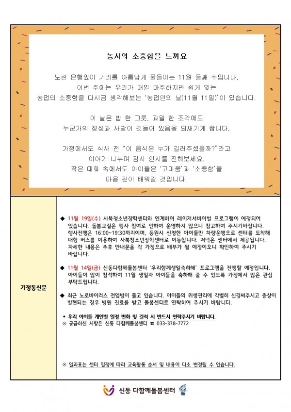 11월 2주차 주간계획안 페이지 정보 작성자 최고관리자 댓글 0건 조회 1회 작성일 25-11-07 19:25 본문 신동 다함께돌봄센터 11월 2주차 주간계획안 공유드립니다~ 목록 다음글11월 1주차 주간계획안 25.11.07 댓글목록 댓글목록 등록된 댓글이 없습니다.