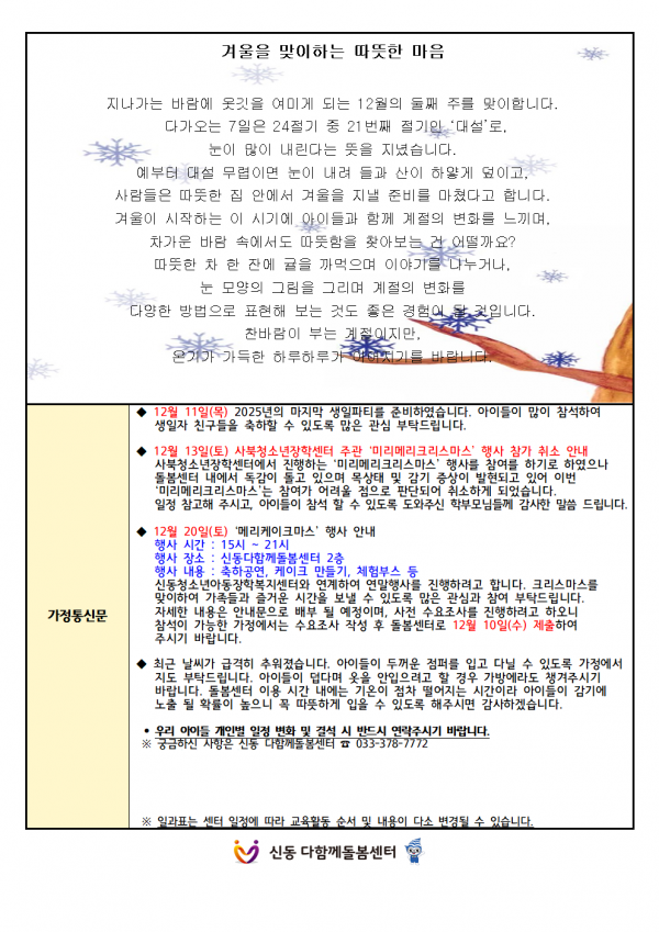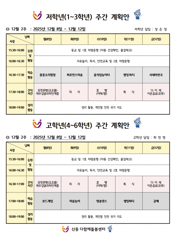 12월 2주차 주간계획안 페이지 정보 작성자 최고관리자 댓글 0건 조회 20회 작성일 25-12-05 21:05 본문 12월 2주차 주간계획안 입니다. 목록 이전글12월 3주차 주간계획안 25.12.16 다음글메리-케이크마스 행사 안내(12/20) 25.12.05 댓글목록 댓글목록 등록된 댓글이 없습니다.
