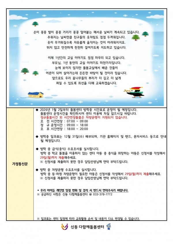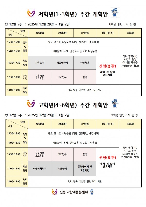 12월 5주차 주간계획안 페이지 정보 작성자 최고관리자 댓글 0건 조회 2회 작성일 25-12-26 20:41 본문 12월 5주차 주간계획안입니다. 목록 다음글신동 다함께돌봄센터 휴관 안내 25.12.24 댓글목록 댓글목록 등록된 댓글이 없습니다.