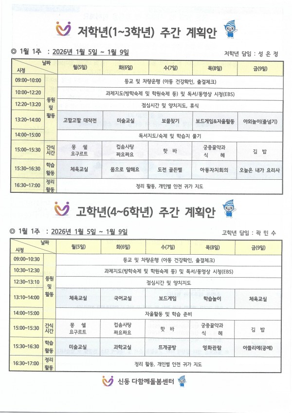 2026년 1월 1주차 주간계획안 페이지 정보 작성자 최고관리자 댓글 0건 조회 15회 작성일 26-01-02 20:41 본문 새해 첫 주간계획안 입니다 일정 참고하여주시기 바랍니다. 목록 이전글2026년 1월 방학중 급식 및 간식 식단표 26.01.07 다음글12월 5주차 주간계획안 25.12.26 댓글목록 댓글목록 등록된 댓글이 없습니다.