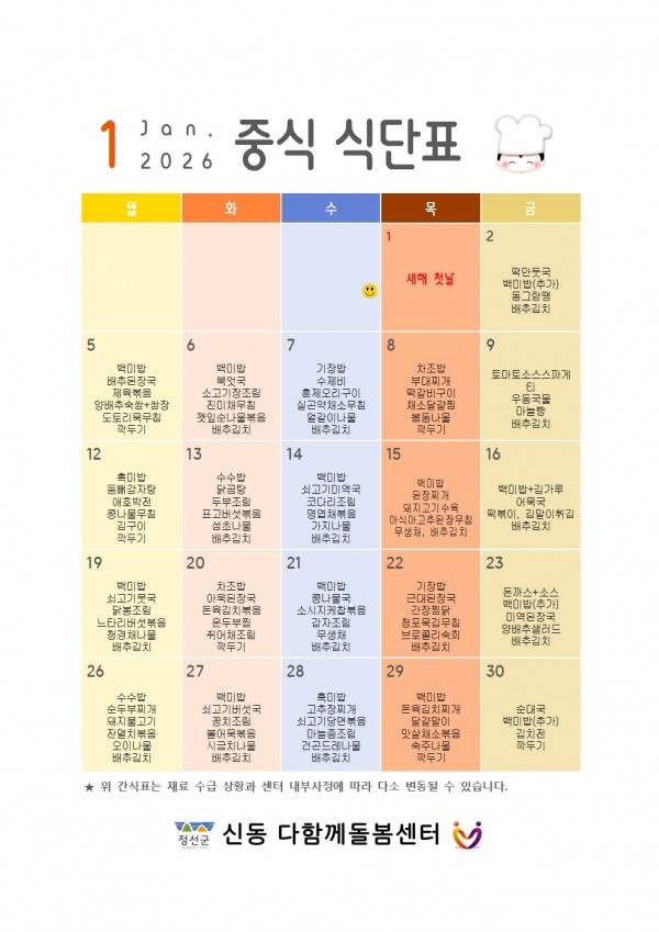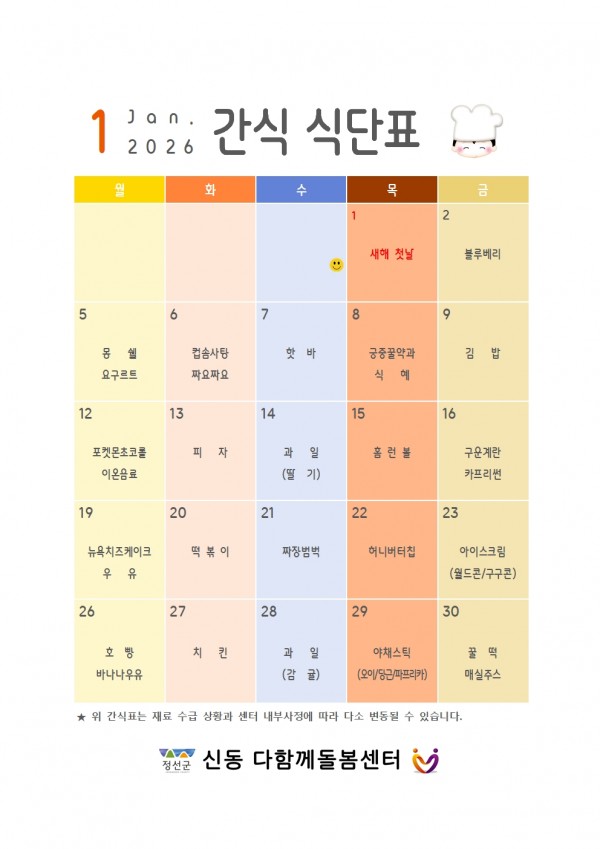 2026년 1월 방학중 급식 및 간식 식단표 페이지 정보 작성자 최고관리자 댓글 0건 조회 14회 작성일 26-01-07 20:29 본문 2026년 1월 방학중 급식 및 간식 식단표 입니다. 목록 이전글야간 연장돌봄 안내 26.01.07 다음글2026년 1월 1주차 주간계획안 26.01.02 댓글목록 댓글목록 등록된 댓글이 없습니다.