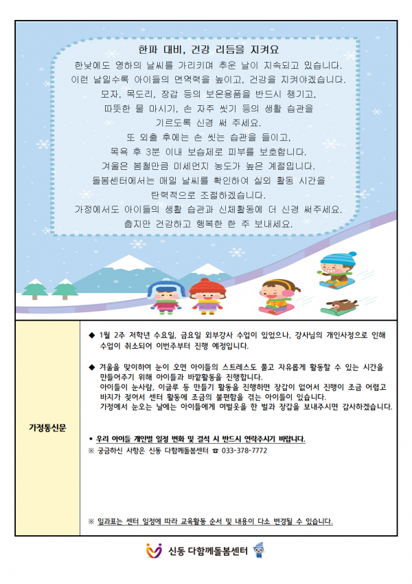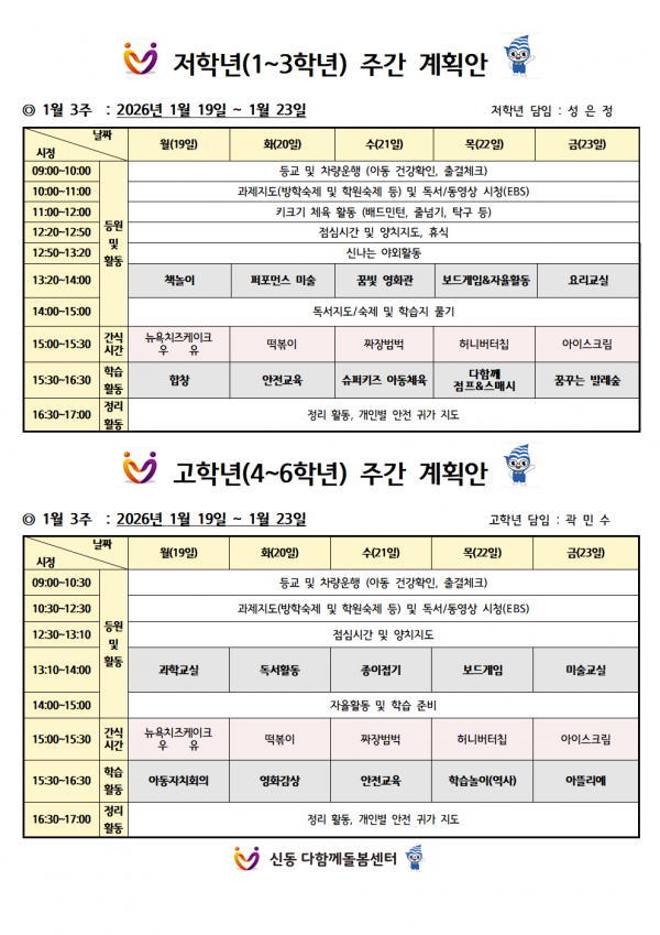 2026년 1월 3주차 주간계획안 페이지 정보 작성자 최고관리자 댓글 0건 조회 8회 작성일 26-01-16 18:17 본문 1월 3주차 주간계획안 입니다. 일정 참고하시길 바랍니다 : ) 목록 이전글2026년 1월 4주차 주간계획안 26.01.23 다음글야간 연장돌봄 안내 26.01.07 댓글목록 댓글목록 등록된 댓글이 없습니다.