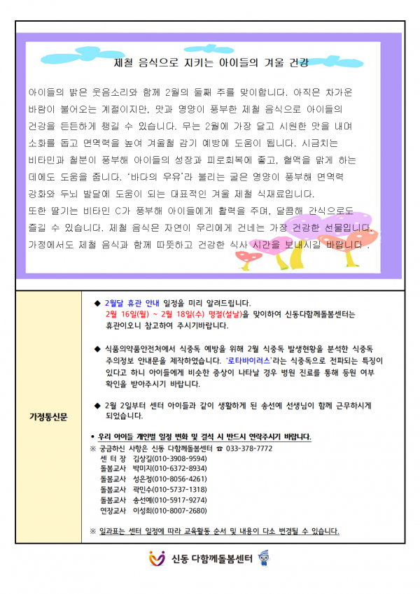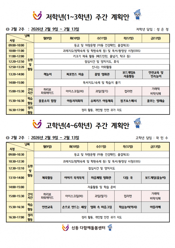 2026년 2월 2주차 주간계획안 페이지 정보 작성자 최고관리자 댓글 0건 조회 3회 작성일 26-02-06 13:44 본문 2월 2주차 주간 계획안입니다. 이용에 참고하시기 바랍니다. 목록 이전글신동 다함께돌봄센터 설연휴 휴관 안내 26.02.06 다음글2026년 2월 1주차 주간계획안 26.02.05 댓글목록 댓글목록 등록된 댓글이 없습니다.
