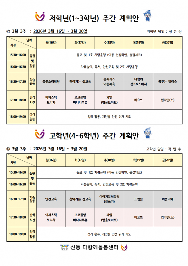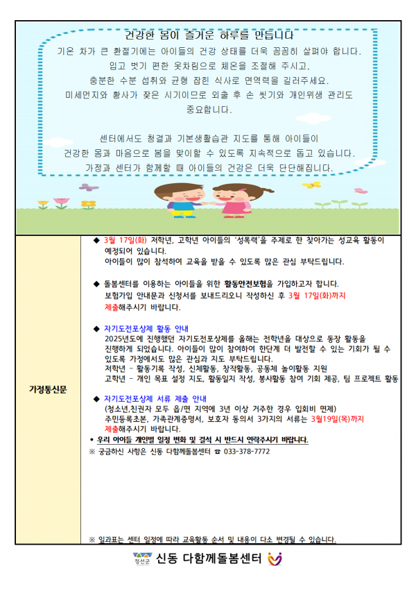 3월 3주차 주간계획안 페이지 정보 작성자 최고관리자 댓글 0건 조회 8회 작성일 26-03-13 13:50 본문 주말잘보내시고 다음주 이용에 참고하시기 바랍니다. 목록 이전글3월 4주차 주간계획안 26.03.20 다음글부모와 자녀가 함께하는 프로그램 26.03.10 댓글목록 댓글목록 등록된 댓글이 없습니다.
