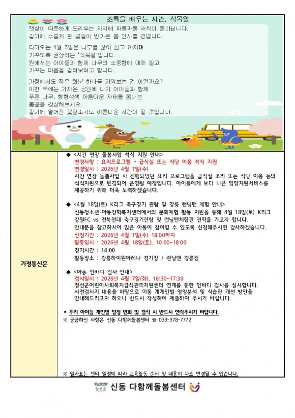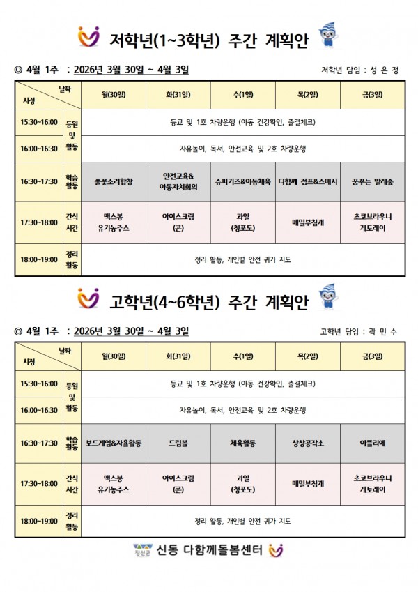 4월1주차 주간계획안 페이지 정보 작성자 최고관리자 댓글 0건 조회 6회 작성일 26-03-28 19:09 본문 4월 1주차 주간계획안올려드리니 이용에참고하여주시기 바랍니다. 목록 다음글3월 4주차 주간계획안 26.03.20 댓글목록 댓글목록 등록된 댓글이 없습니다.