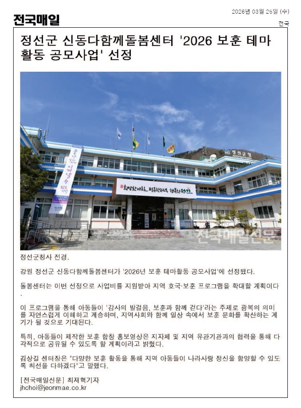 신동 다함께돌봄센터 국가보훈부 '보훈테마활동' 공모사업 선정 페이지 정보 작성자 최고관리자 댓글 0건 조회 11회 작성일 26-03-26 20:41 본문 보훈테마활동 공모사업에 선정되었습니다. 감사합니다 목록 다음글신동 다함께돌봄센터) 호흡기 감염병 예방수칙 안내 26.02.10 댓글목록 댓글목록 등록된 댓글이 없습니다.