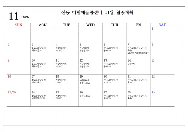 2025년 11월 월중행사 계획 페이지 정보 작성자 최고관리자 댓글 0건 조회 2회 작성일 25-11-07 10:36 본문 2025년 11월 신동 다함께돌봄센터 월중행사 계획입니다. 목록 다음글9월 월중행사계획 25.09.16 댓글목록 댓글목록 등록된 댓글이 없습니다.