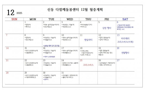 2025년 12월 월중행사계획 페이지 정보 작성자 최고관리자 댓글 0건 조회 36회 작성일 25-12-01 19:29 본문 12월 월중행사계획입니다. 목록 다음글2025년 11월 월중행사 계획 25.11.07 댓글목록 댓글목록 등록된 댓글이 없습니다.